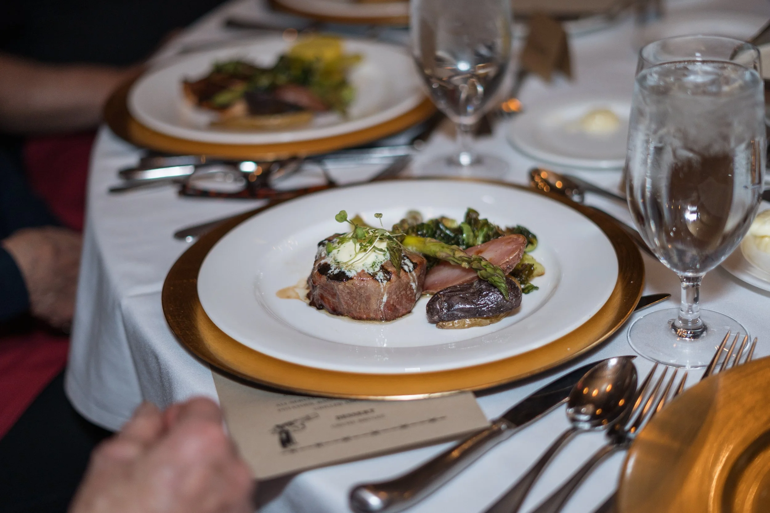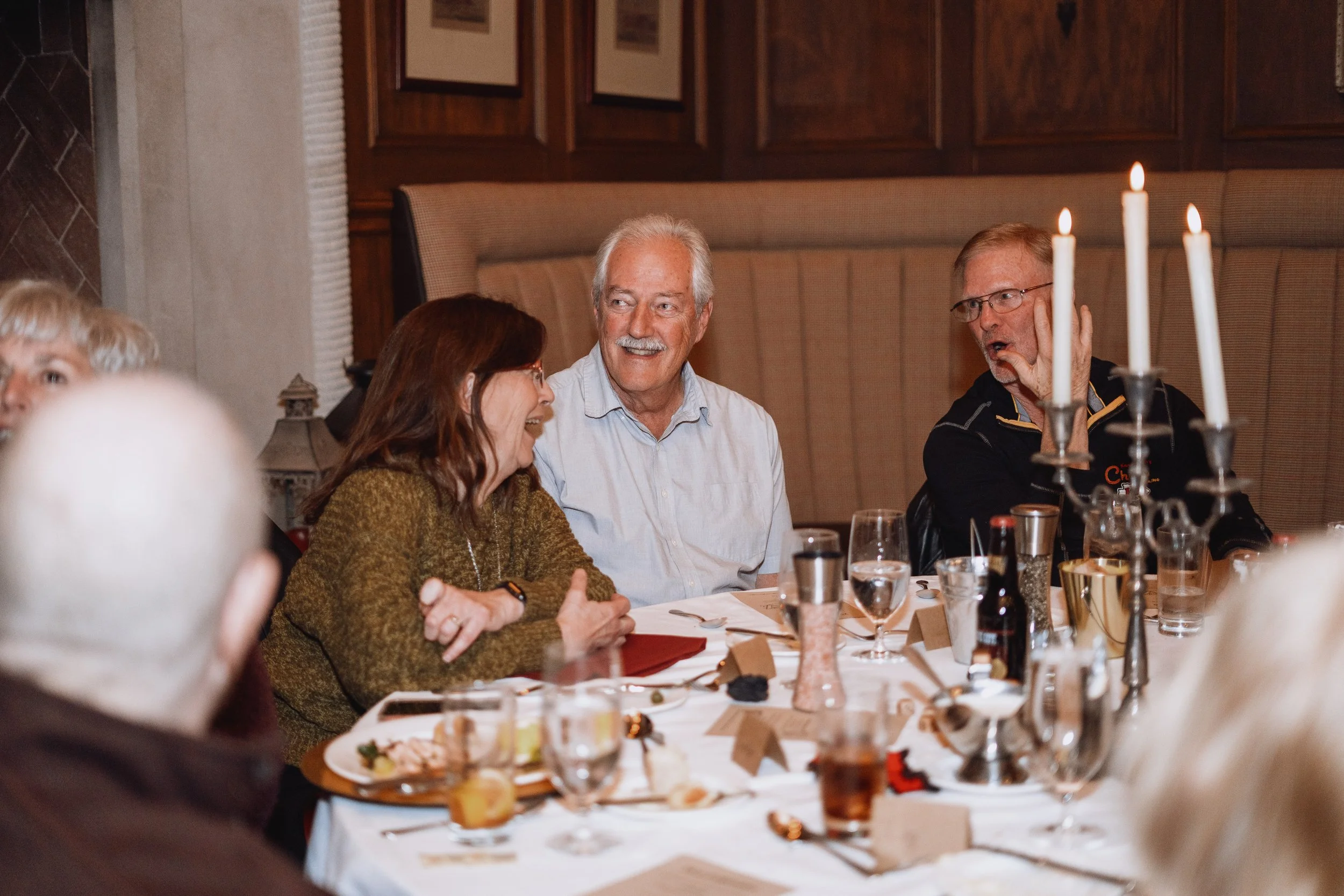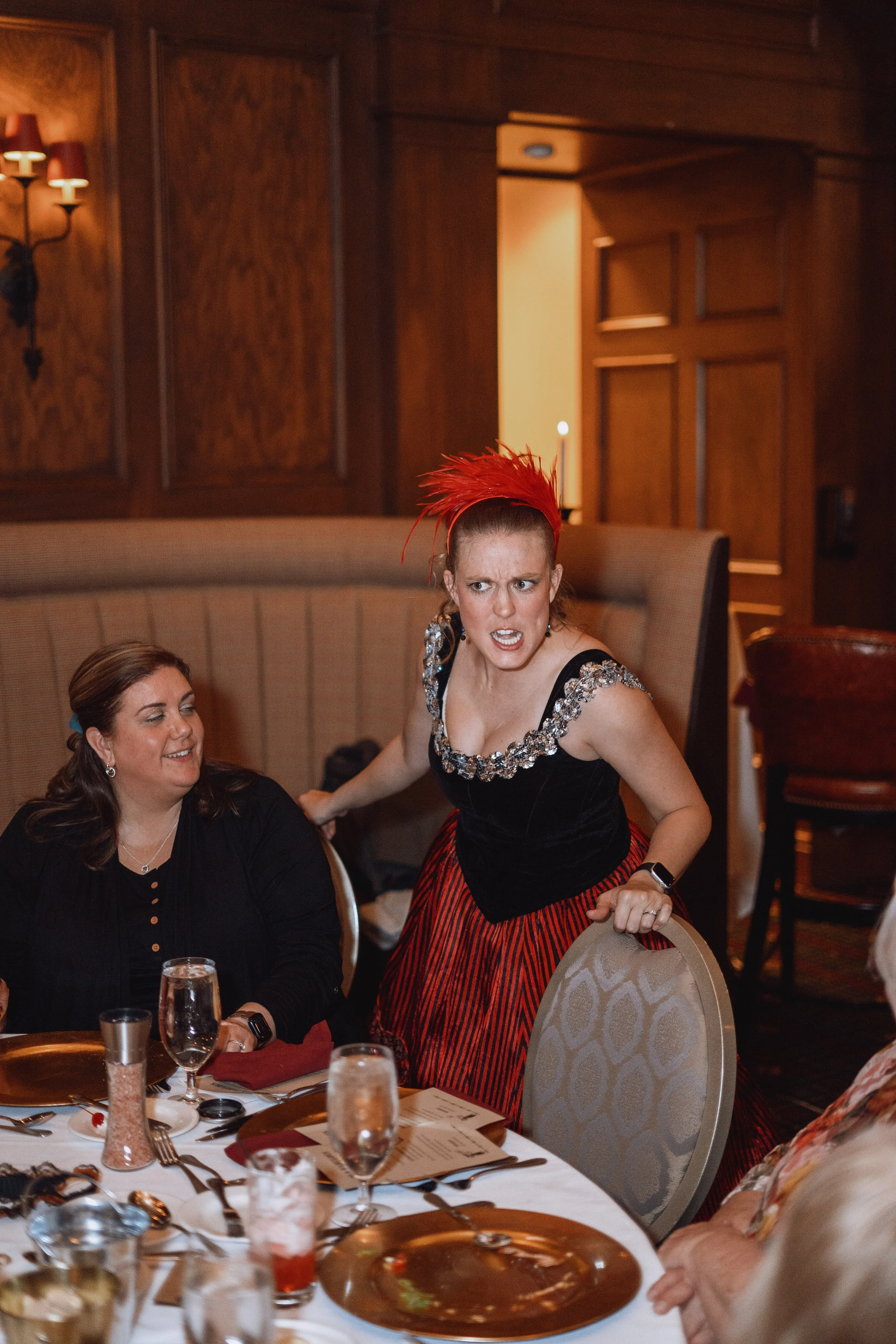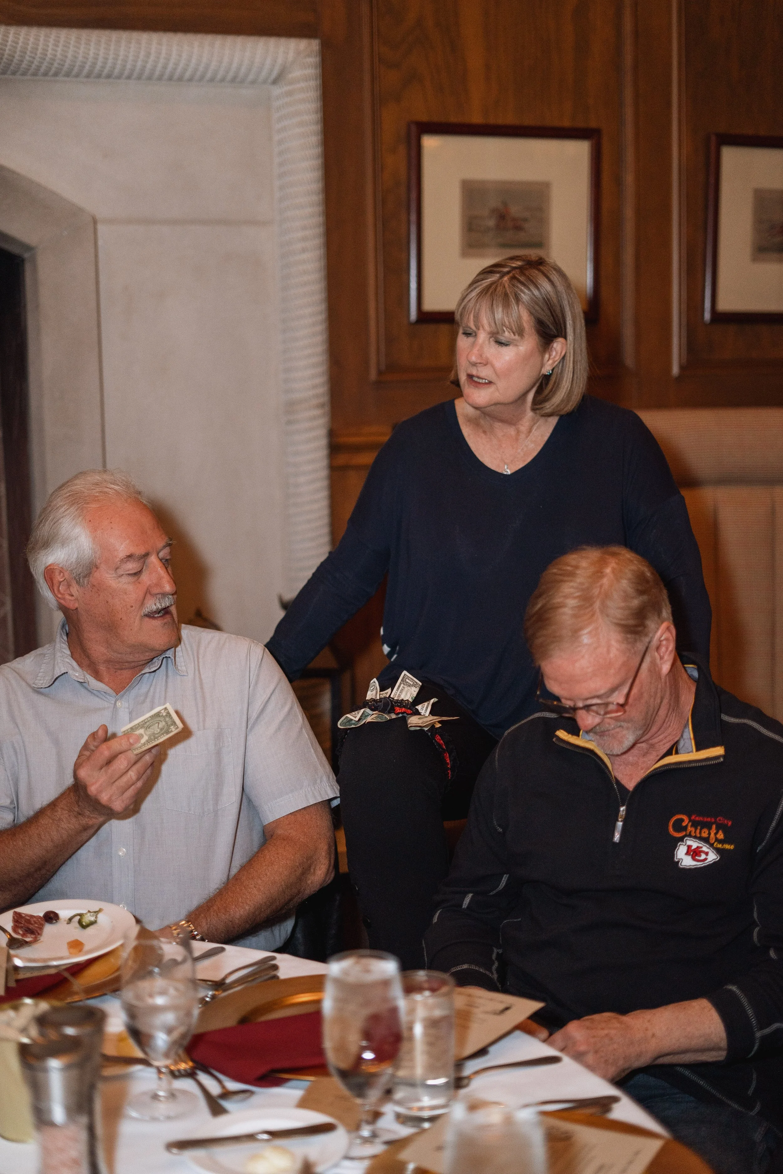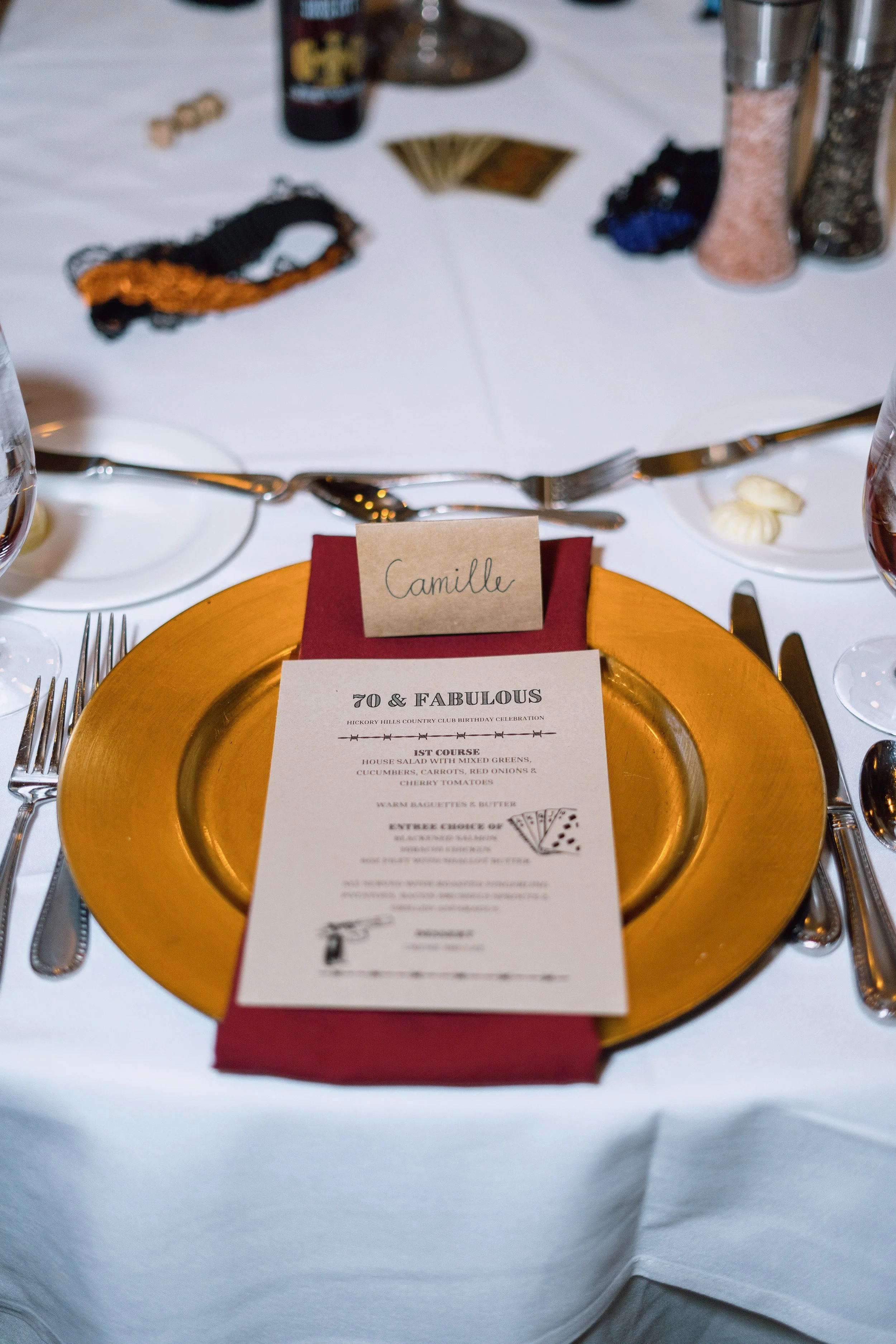 I photograph many events, but this one stood out from the rest. It was a special birthday dinner for one of the first saloon dancers at Silver Dollar City, and the theme was a Wild West murder mystery. As the guests settled in and got to know each other, they began to mingle and enjoy cocktails. Then, it was time to move on to the salads, followed by the main course - steak or salmon. After dinner, a portion of the murder mystery story was read, and questions were asked to see if anyone could guess the outcome. To end the night on a sweet note, everyone enjoyed crème brûlée for dessert. All in all, it was a truly unique and memorable evening for everyone there.