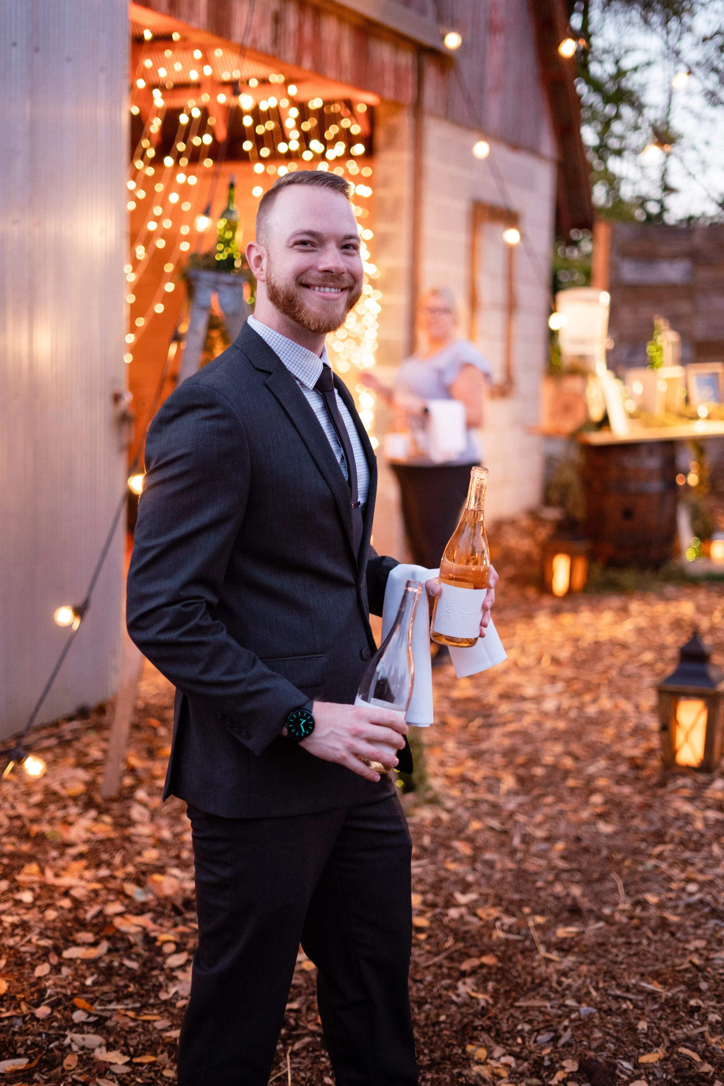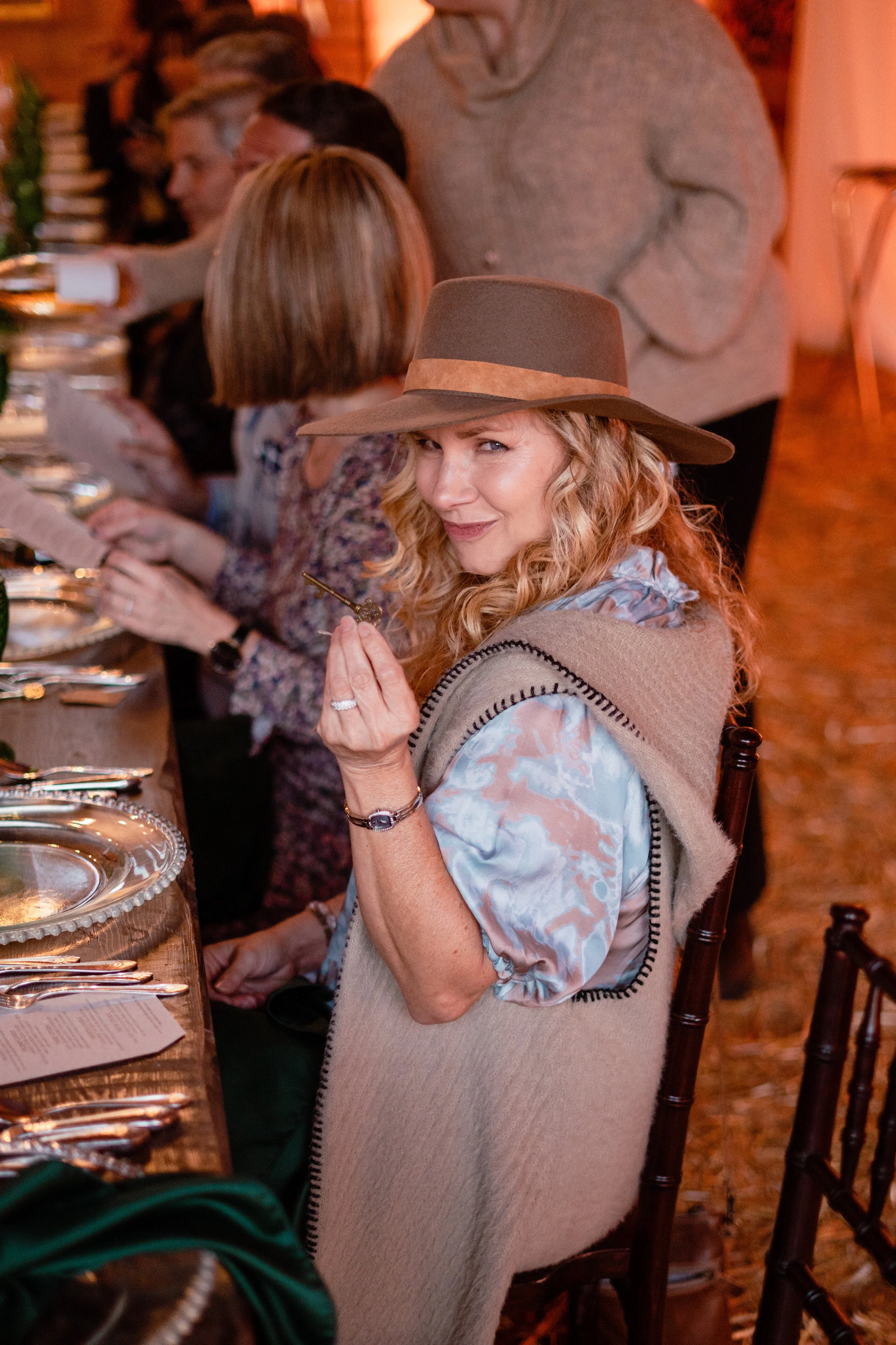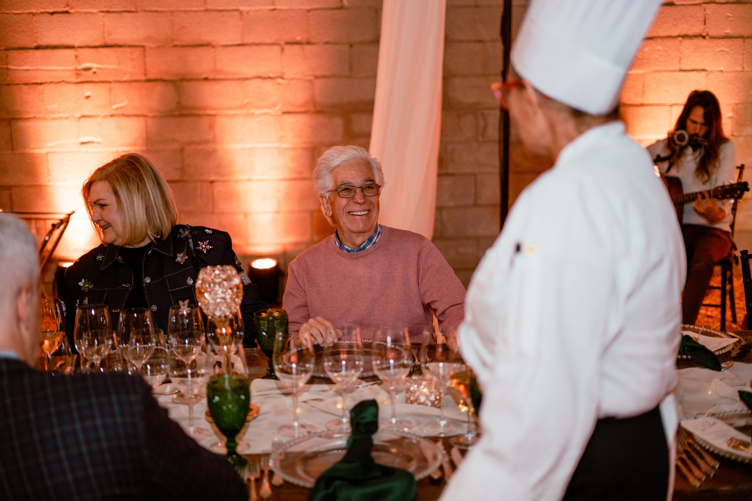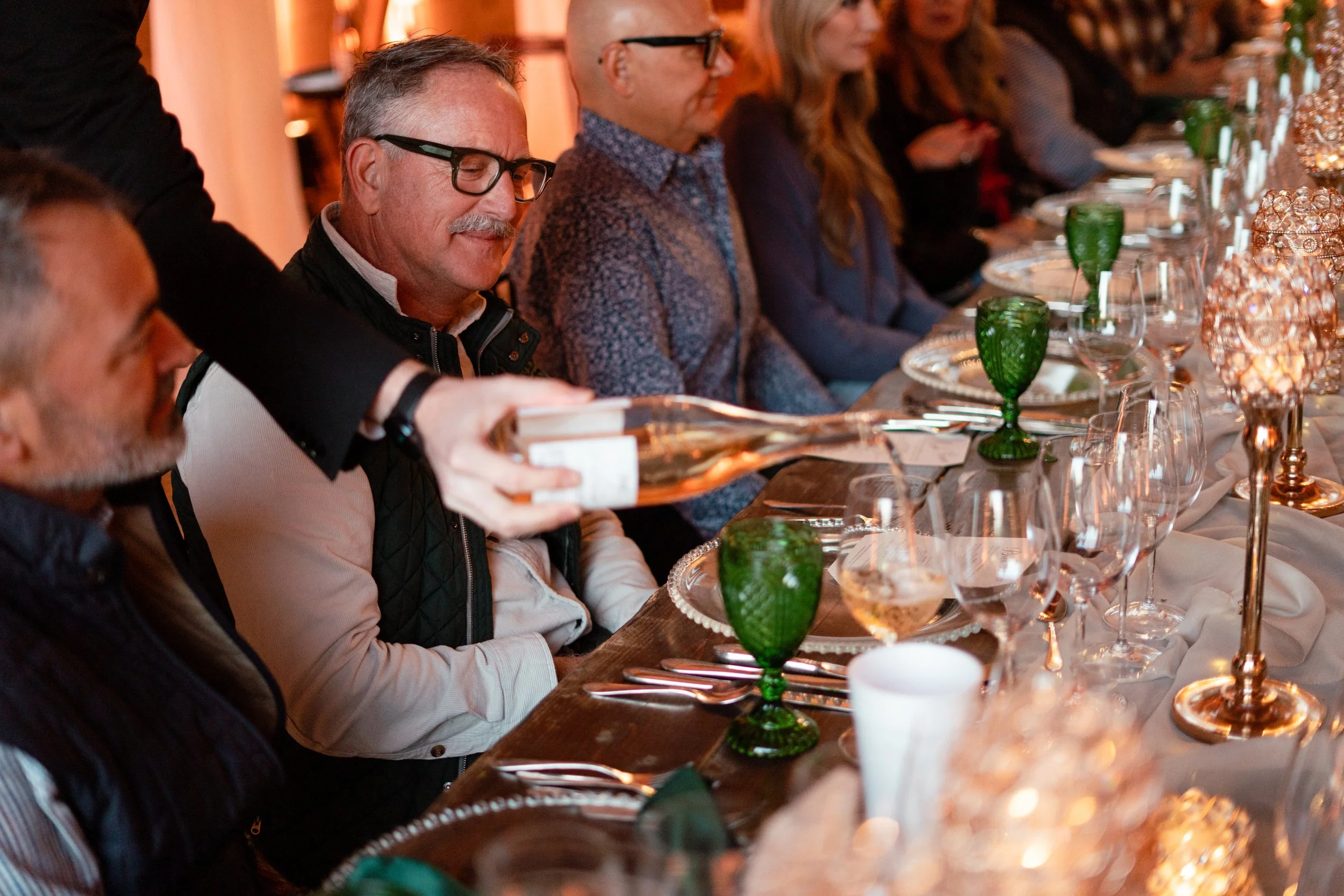 The event is held in a barn and the decor is designed to match the rustic setting. The table was decorated with jade-colored glass goblets, candles, and wildflowers, creating a cozy and inviting atmosphere.